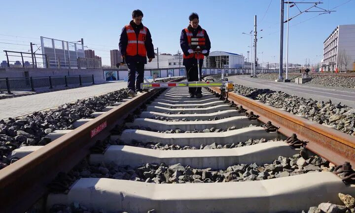 1月20日,中国铁路北京局集团有限公司北京高铁工务段的工作人员在使用轨道检查仪进行作业。新华社记者李安摄