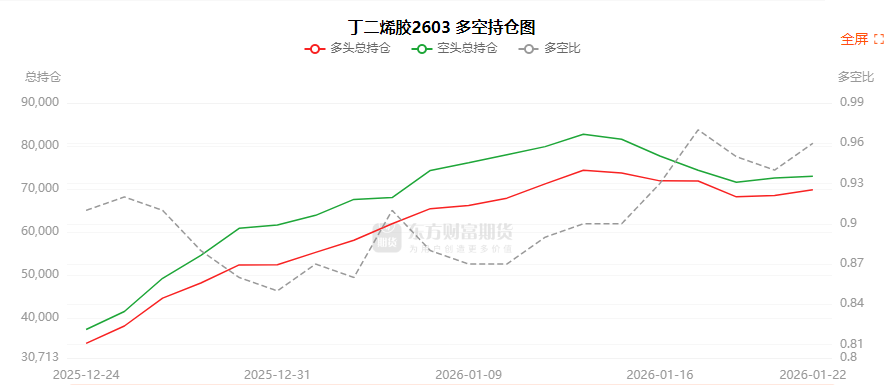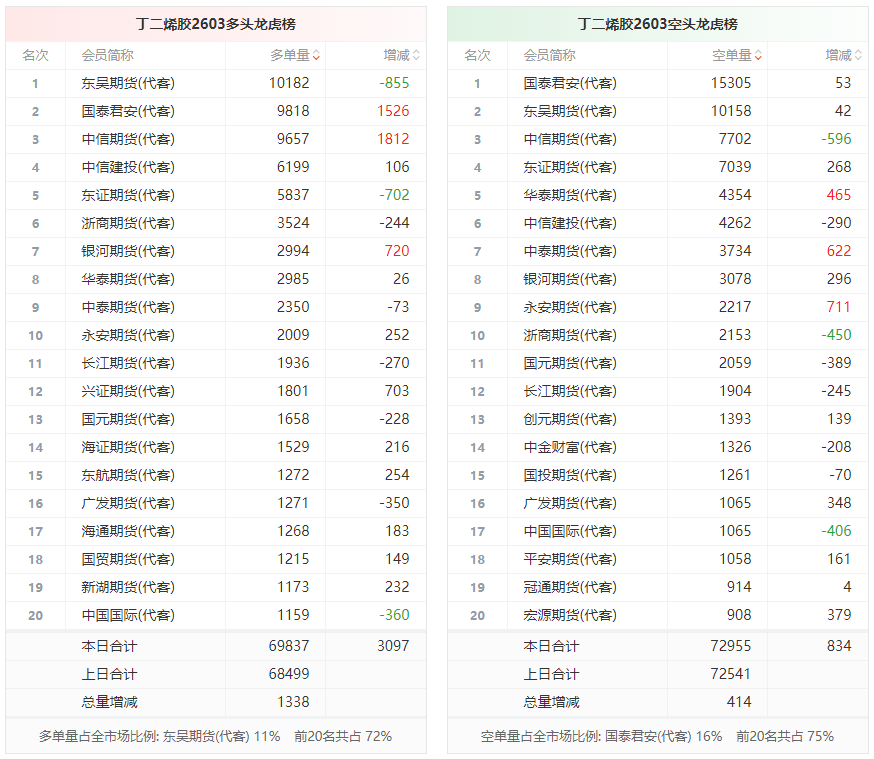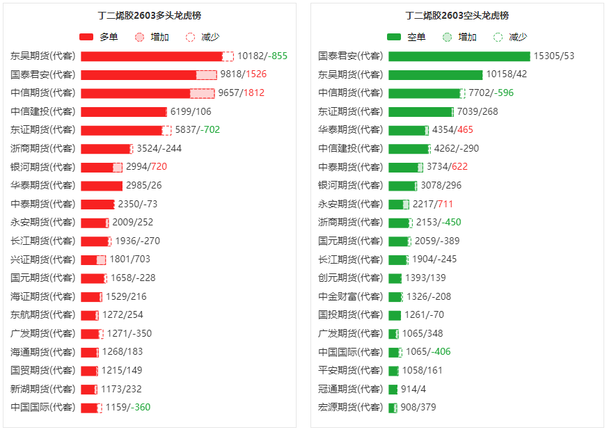 总体而言,丁二烯胶2603合约今日增仓上行,多空持仓排名前20席中,多空双方均呈进场态势,多头进场意愿强于空头。